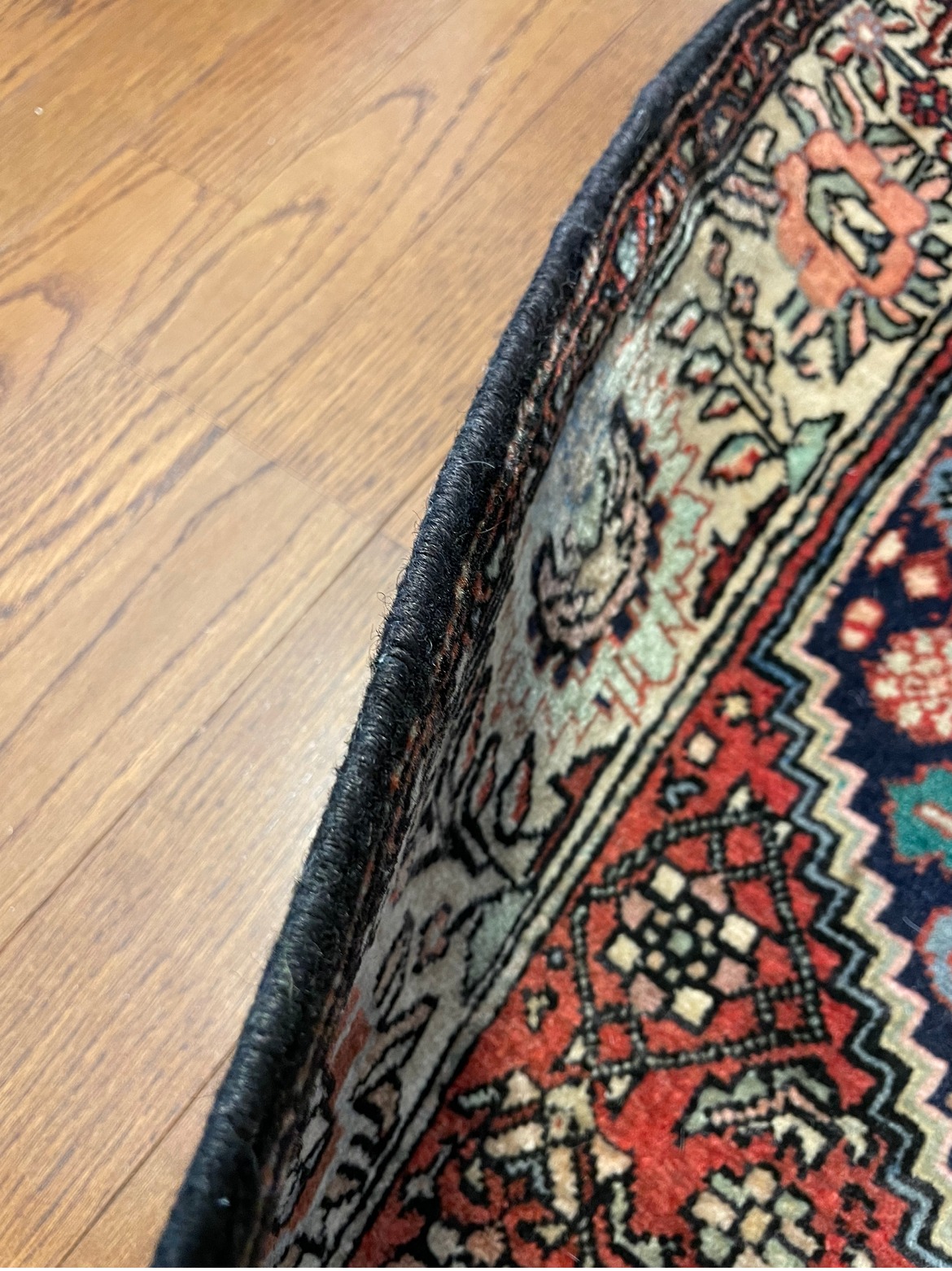 改めて全体を見て見ると、その雰囲気から織られてからそれ相応の年数が経っているものと思われます。116×78cmとそれほど大きなラグではありませんが、どこか気品を感じるラグだと思います。どこに敷いても、その周りの雰囲気がワンランク上がる様な気がします😉。