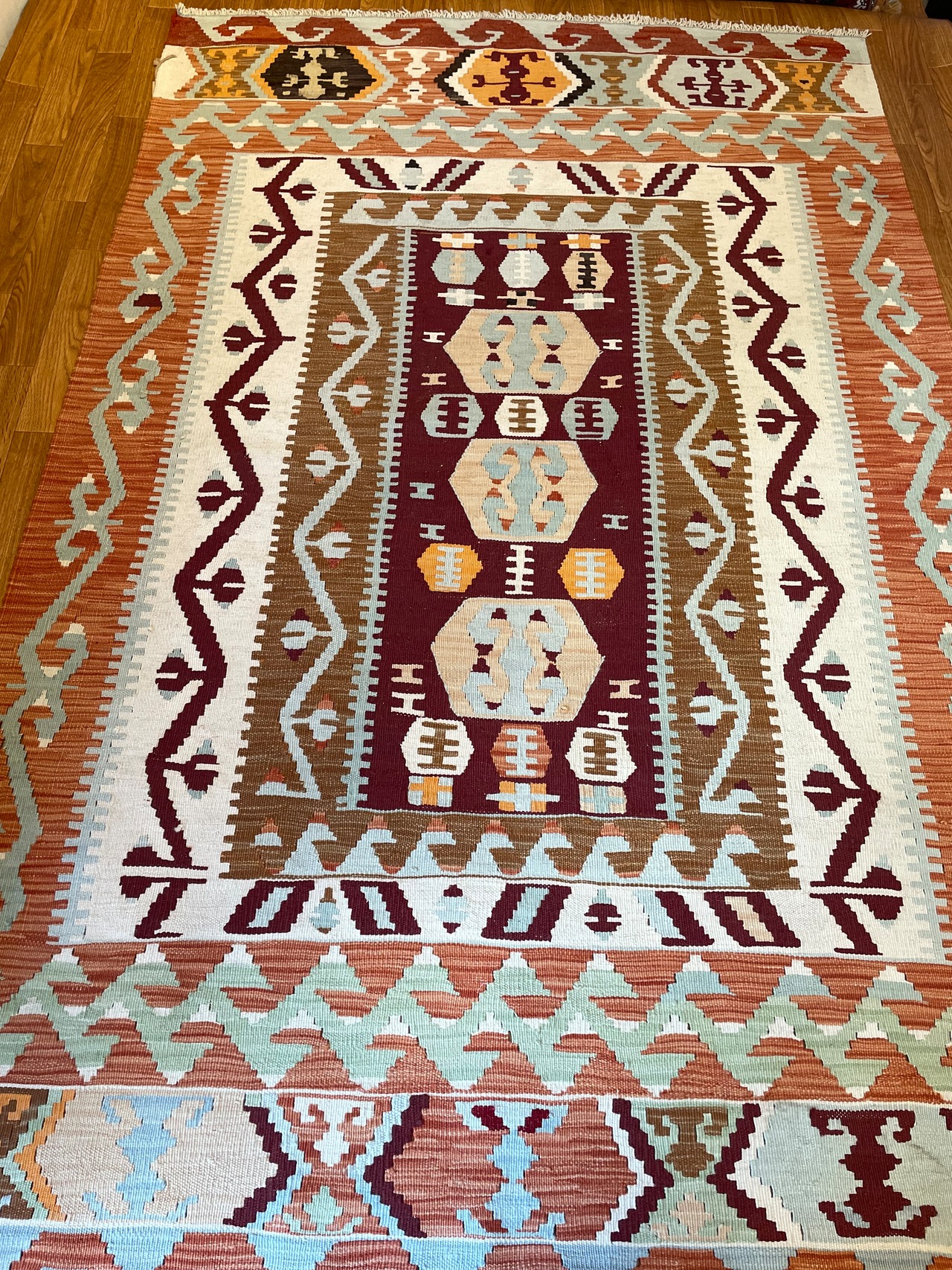 オレンジ色、アズキ色、イエローブラウン。言葉で表すのが難しい色の秋色キリムが入荷しました。