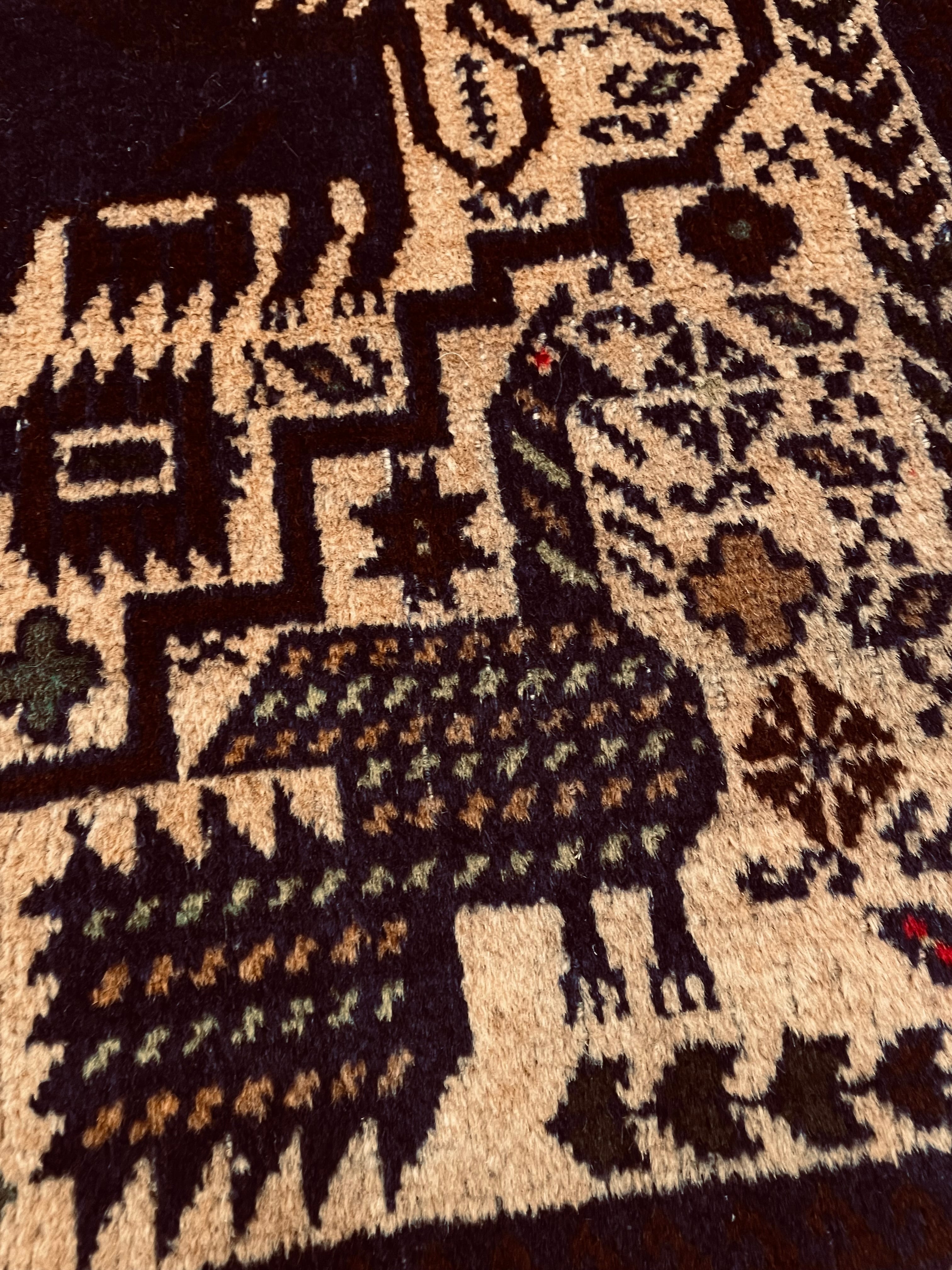 約60年前に織られたアフガニスタン産のバルーチ。一見幾何学模様のようですが、実は動物柄。とてもレアな一枚です。