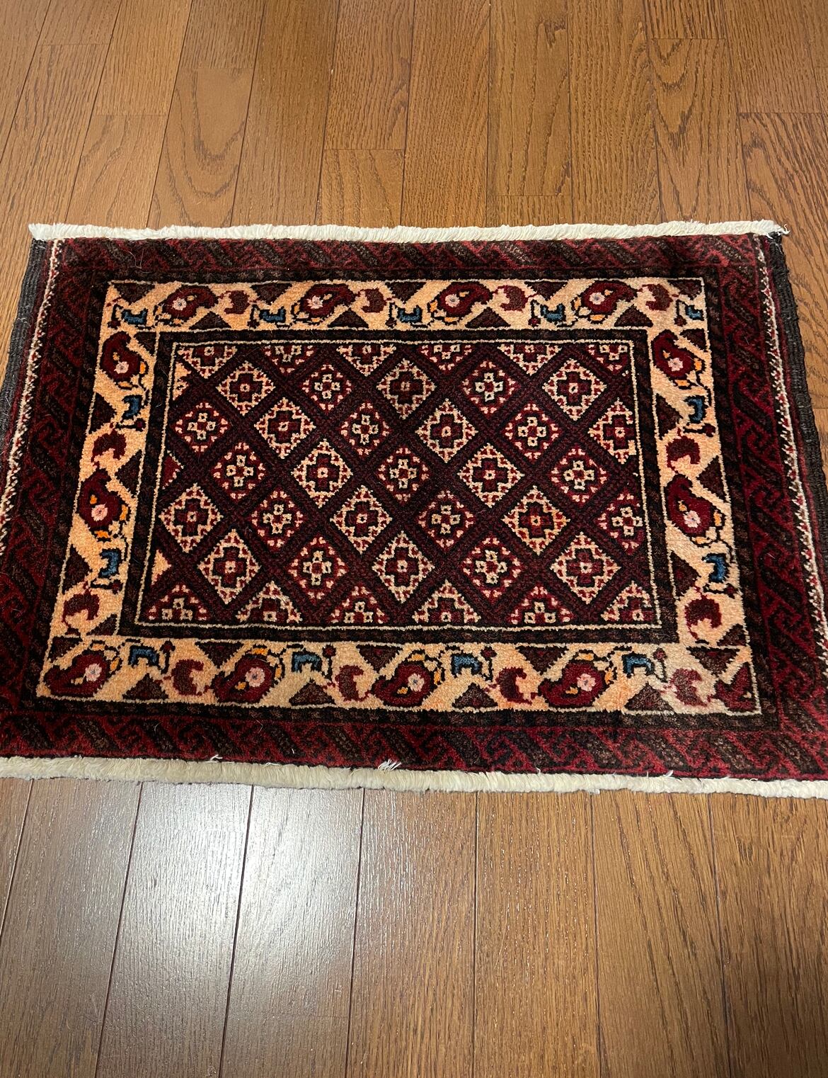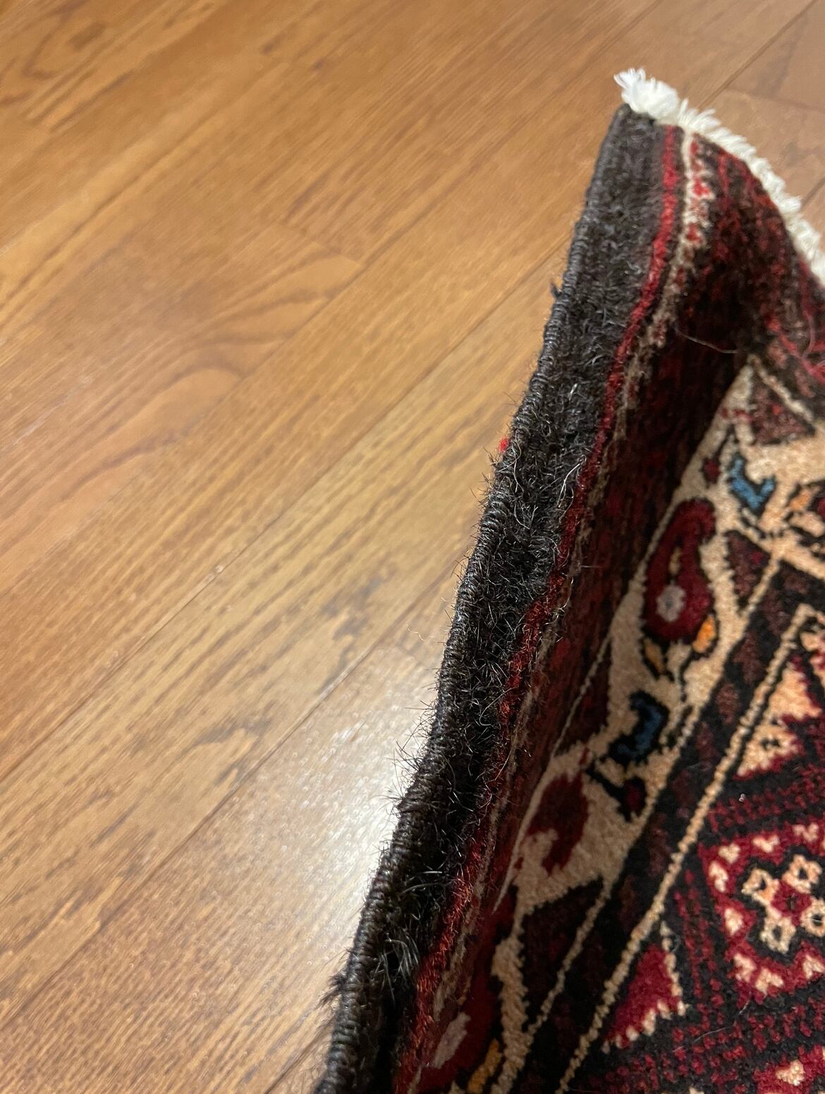 少し小さめの玄関にピッタリなバルーチのラグです。ジョフトと言って、ほぼ同じデザインの物が2枚あります。一応ナンバー付けましたが、違いはほとんどありません。バルーチとしては毛足もあり、厚みも0.7cmほどあります。手触りも柔らかくて気持ちいいです。両サイドがキリム仕上げになっています。