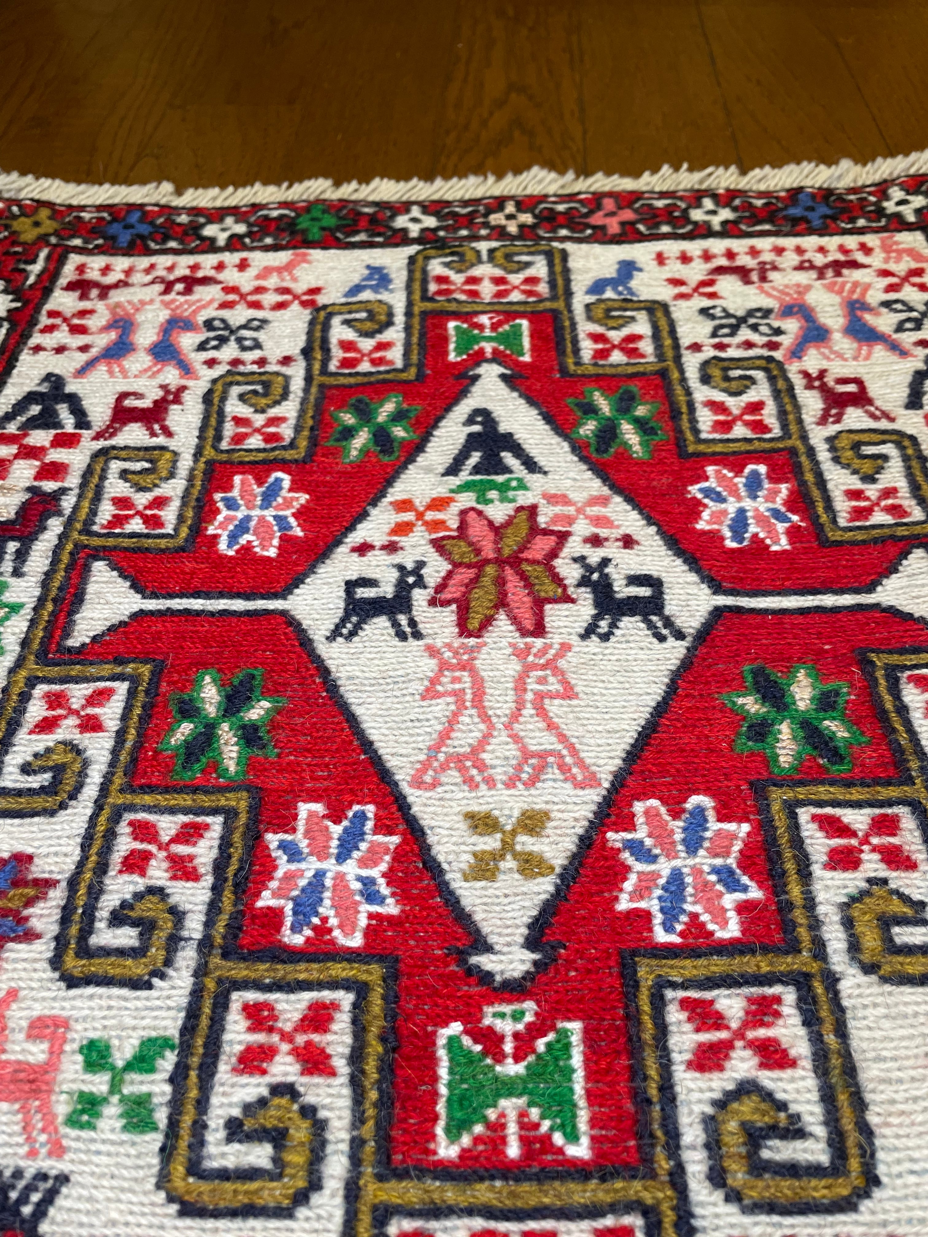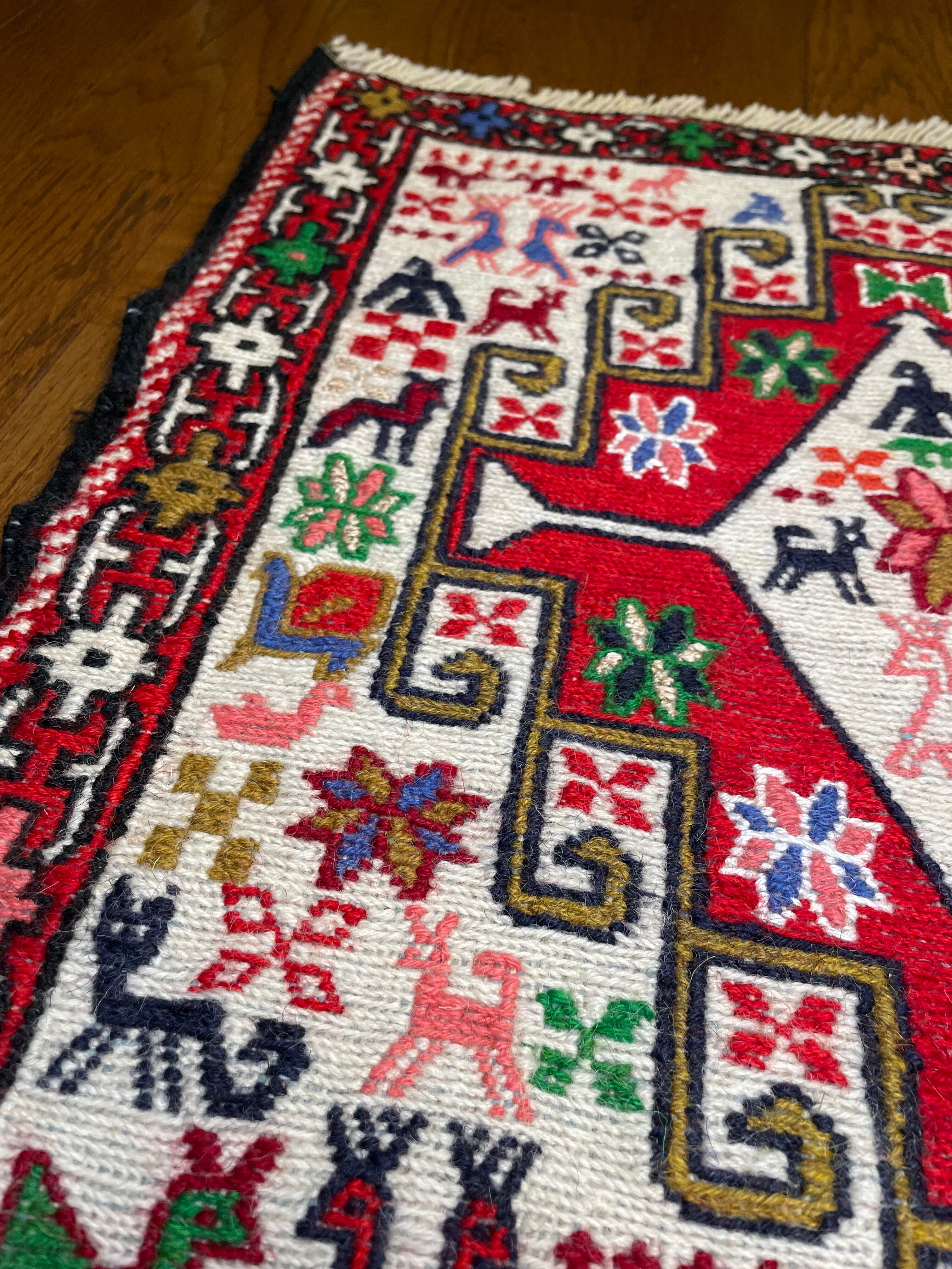ほぼ正方形のミニヴァルニです。こちらはセンターが白です。周りにはネコや鳥や鹿、それにキツネらしき動物が織り込まれています。座布団には少し大きいので、最後の写真の様にソファーに敷くのがお勧めです。